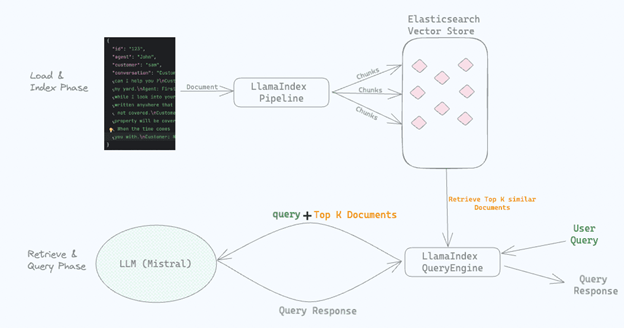 Diagram: RAG pipeline using Elastic Search for retrieval and Mistral for generative interpretation, via LlamaIndex.